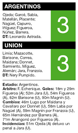 Unión, ubicado en zona de descenso, rescató esta tarde un agónico pero merecido empate 3-3 en La Paternal ante el local Argentinos, por la octava fecha del torneo Inicial. El equipo tatengue, que cosecha apenas 3 unidades, producto de tres igualdades consecutivas, evitó una nueva derrota en tiempo de descuento, con un gol de cabeza de Pablo Magnín, tras una grosera falla de Diego Placente. Los otros goles de Unión, que había mostrado un buen rendimiento en la primera parte, fueron logrados por Diego Jara (al recoger un rebote en el arquero Luis Ojeda, tras un penal que él mismo ejecutó) y Diego Barisone. Marcos Figueroa, el delantero que procede de Central Córdoba, se erigió en la figura del equipo de Leonardo Astrada (12 puntos), al aportar los tres tantos.