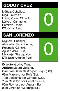 En el debut del ciclo del entrenador Juan Antonio Pizzi, San Lorenzo empató ayer 0-0 de visitante con Godoy Cruz, un resultado que lo mantiene en la zona roja del descenso directo de categoría. Si bien San Lorenzo terminó con una mejor imagen que el adversario, el resultado estuvo bien porque a los dos equipos les faltó profundidad en los últimos metros. De esta manera, el Ciclón sigue alejado de los triunfos en el torneo Inicial y Godoy Cruz por lo menos sumó luego de la estrepitosa caída en el Monumental ante River por 5-0.