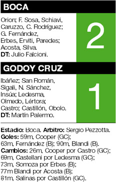 Los insultos del entretiempo (“¡Falcioni, h... de p...!) amainaron en el segundo, a causa de la victoria inesperada –cuando Godoy Cruz echó a su defensa de cinco hombres excesivamente atrás y Blandi cabeceó en el área chica– y del homenaje a Schiavi. Pero Boca volvió a hacer honor a las convicciones del zaguero, que repite que el equipo no da tres pases seguidos. Apenas Guillermo Fernández (autor de la jugada y del gol del empate) y Erviti sobresalieron.