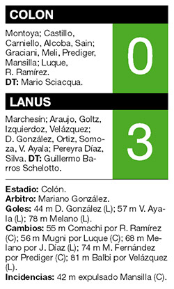 Lanús abrió el marcador por medio de Diego González al final del primer tiempo, dos minutos después de la expulsión del mediocampista de Colón Jacobo Mansilla, por doble amonestación. El hombre de más le dio facilidades al equipo de Guillermo Barros Schelotto, que volvió a mostrar su mejor versión y dominó el resto del encuentro.