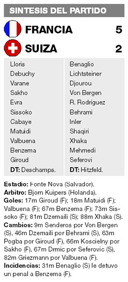Francia goleó ayer 5-2 a Suiza y quedó como líder del Grupo E del Mundial. Los goles del equipo francés, que había derrotado a Honduras por 3-0 en la primera fecha, los convirtieron Olivier Giroud, Blaise Matuidi, Mathieu Valbuena, Karim Benzema y Moussa Sissoko. Los de Suiza los hicieron Blerim Dezemaili y Granix Xhaka. Francia definió el partido en el primer tiempo, cuando abrió el marcador Giroud con un impecable cabezazo, al conectar un corner ejecutado por Valbuena desde la derecha, que se metió en el ángulo izquierdo del arquero Diego Benaglio.