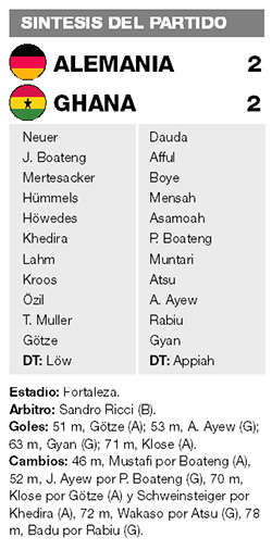 Ghana, que en rigor propuso un partido atractivo, lo dio vuelta en un cuarto de hora, con un cabezazo de André Ayew (que será jugador de Marcelo Bielsa en el Olympique Marseille) y con un remate cruzado de Asamoah Gyan, tras un pase inteligente de Muntari. Con ese gol, Gyan alcanzó al mítico Roger Milla como el máximo artillero africano de la Copa del Mundo, ambos con cinco tantos. Los africanos pudieron ganarlo en uno de los últimos lances del encuentro cuando, en un contragolpe, cinco ghaneses quedaron frente a solo tres alemanes, pero en el primer pase largo uno de los hermanitos Ayew la recibió fuera de juego...
