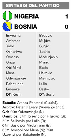 Con el gol de Peter Odemwingie, Nigeria derrotó ayer 1-0 a Bosnia y quedó perfilado para pasar a octavos de final el próximo miércoles ante Argentina, si por lo menos logra un empate. El equipo europeo no mostró el buen fútbol que lo clasificó al Mundial e hizo muy poco por revertir el resultado, aunque sufrieron un gol mal anulado por el árbitro del partido.