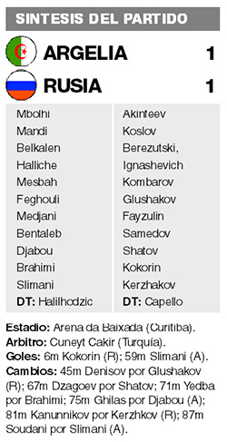Cuando Aleksandr Kokorin clavó en el ángulo un preciso cabezazo, todo parecía indicar que Rusia tenía todo allanado para clasificarse a la siguiente fase. Incluso, en los minutos posteriores el dominio de Rusia fue claro, con algunas chances de aumentar la diferencia. Pero como se fue conformando rápido, Argelia creció en su juego y, ya en la segunda etapa, llegó al merecido empate con un cabezazo de Islam Slimani, que aprovechó una pésima salida del arquero Akinfeev. A partir de allí, el conjunto africano cuidó el resultado, al tiempo que los rusos exhibían toda su impotencia para generar situaciones de peligro.