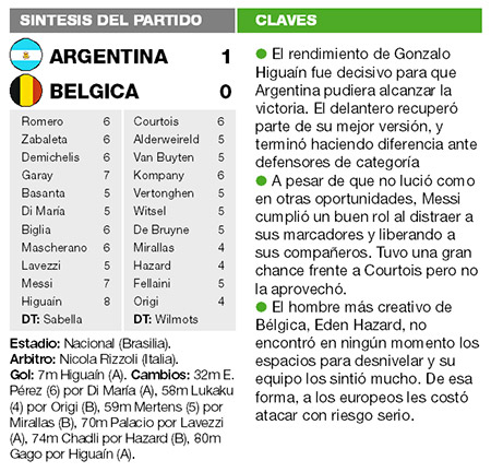 La Selección volvió a meterse entre los cuatro primeros de una Copa del Mundo, lo que no sucedía desde Italia 1990, 24 años atrás. Con un rendimiento colectivo superior a lo que había mostrado hasta ahora en Brasil, la victoria sobre Bélgica fue absolutamente merecida, gracias al golazo de Gonzalo Higuaín. Di María se queda fuera del Mundial.