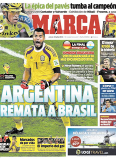 La construcción deportiva del otro como antagonista, de la otredad –si se permite– en términos filosóficos, de esa explicación que en Brasil se intenta esbozar ante lo inexplicable (el 7-1 en contra con Alemania, ver a la Argentina en la final del Mundial), es un ejercicio que la prensa local intenta por estas horas con una ligereza y chauvinismo que alarma. Lo curioso es que en España se construye sentido en la misma sintonía. Marca tituló en su tapa: “Argentina remata a Brasil”. La Selección eliminó a Holanda, pero en el imaginario colectivo el rival es otro. Es Brasil.