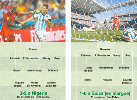 4 - La lesión de Agüero facilitó el ingreso de Lavezzi como titular, el resto del equipo se mantuvo. Sufrió la falta de espacios y no pudo repetir lo hecho ante Nigeria. Recién pudo resolverlo en el alargue con Di María.
