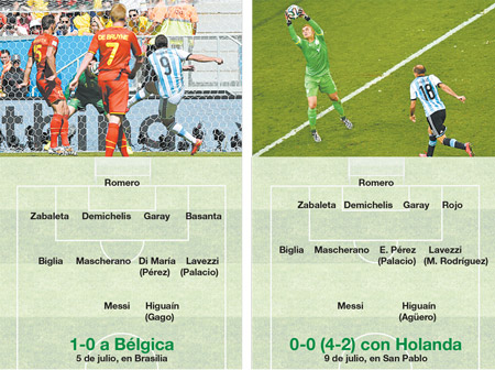 6 - Con el 4-4-2 consolidado, con más equilibrio, fue el mejor partido como equipo. Messi apareció poco, pero brillaron Mascherano, durante los 120 minutos de partido, y Romero en los penales.