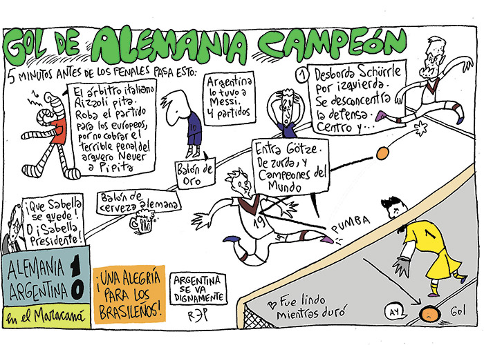 El trompa Sabella tira la bronca cuando un purrete se cuela (y lo caza la taquería) pero más tira la bronca porque se pierden muchos goles, muchachada loca. La de Messi, la de Higuaín, la del orsai y ni qué hablar de la de Palacio, que lo midió a Neuer, lo midió y, qué desencuentro Palacio, quisiste darle con ternura y el miedo te devoró de atrás y te salió un tiro con la canilla. Goles que se pierden y que son como gotas de vinagre derramadas sobre las heridas y el gol es la esperanza que no llega, que no alcanza y no puede vislumbrar la tarde mansa y lo que se vislumbra son los penales y araca corazón, si hay que ir otra vez a una definición por penales, pero no porque cuando el antiguo reloj de cobre marca que sólo falta un puñadito de minutos, cuando colorado el 19 el tal Götze la baja con el pecho, porque en esa jugada la defensa argentina es más frágil que el cristal, y tira y es gol, y lo gritan los alemanes y más lo gritan los brasileños, rencor, mi viejo rencor.