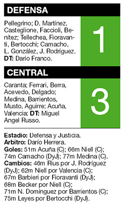 Con los goles de Walter Acuña, Franco Niell y Antonio Medina, Central venció ayer a Defensa y Justicia por 3-1 como visitante y se trepó al tercer puesto del torneo de Primera División. “Fue un triunfo merecido, aunque teníamos que haber asegurado el partido antes. Logramos un buen funcionamiento haciendo cambios en el equipo, son muchos los compromisos que tenemos y nos apoyamos en los chicos del club”, resaltó después de la victoria el entrenador de Central, Miguel Angel Russo. El equipo de Florencio Varela no levantó cabeza después de perder ante River en Núñez y lleva tres partidos sin ganar.