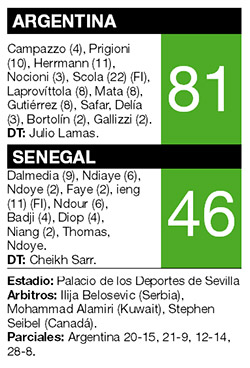 Argentina levantó su imagen y venció con claridad 81-46 a Senegal para evitar el temido cuarto lugar y tener aún aspiraciones de ganar el Grupo B del Mundial de España. Salvo un pasaje del tercer cuarto, el conjunto de Julio Lamas jugó en gran nivel en Sevilla y se dio el lujo de poner a todos los jóvenes de la nueva camada, incluso Matías Bortolín y Tayavek Gallizzi, ambos de 21 años y que aún no habían debutado en el certamen. El capitán Luis Scola, con 22 puntos y 14 rebotes, volvió a tener una actuación estelar y jugó menos de 30 minutos, pensando en lo que sigue en el torneo. Con la victoria, Argentina llegó a un record de 3-1 y todavía aspira al primer lugar, algo que conseguiría si hoy vence a Grecia (desde las 17, por la TV Pública y TyC Sports).