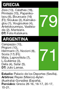 El equipo nacional llegó a ponerse a dos puntos de Grecia en el último cuarto, pero no pudo contra el poderío helénico y se clasificó en tercer lugar en el Grupo B, con lo que reeditará el clásico sudamericano, el domingo.