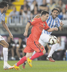 Un apagado Lionel Messi no pudo marcar y el Barcelona cedió sus primeros puntos en la Liga de España, empatando sin goles ante el Málaga como visitante. De esa manera, fue alcanzado en el tope de la tabla por el Sevilla, que superó 2-1 a la Real Sociedad. Si el Valencia vence hoy al Córdoba, también se sumará a la punta. A su vez, el Atlético Madrid consiguió su centésimo triunfo desde que lo dirige Diego Simeone, al ganar 1-0 en Almería, y quedó a dos puntos de los líderes.