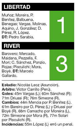 River pudo continuar con su racha exitosa también en la Copa Sudamericana y ganó en Asunción frente a Libertad de Paraguay, en el partido de ida de los octavos de final. Este duelo estiró la marca a 25 encuentros sin perder que mantiene el conductor Marcelo Gallardo al frente del plantel, desde que asumió, en esta temporada. El nivel de juego del conjunto de Núñez no fue el mejor, pero sus individualidades pudieron desequilibrar como lo hacen en el torneo local. El partido tuvo dos interrupciones, ambas en el segundo tiempo, por un corte de luz en la ciudad, lo que desvirtuó demasiado el espectáculo.