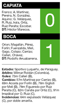 Con la misma predisposición del arranque, salió Boca a jugar la segunda parte y volvió, también en los primeros minutos, a tener dos chances claras como para abrir la cuenta, pero otra vez no prosperaron. Los minutos siguieron corriendo y Boca no encontraba el camino, ante un rival que prácticamente había resignado sus ataques. La expulsión de Velázquez a los 64, por doble amarilla, le facilitó a Boca el trámite. Capiatá sintió el golpe y los visitantes se le fueron encima. El gol llegó tras un centro de Colazo, que Chávez le bajó a Calleri para que éste, encimado por el arquero Franco, sacara el remate para el 1-0.