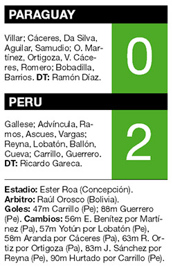 El seleccionado de Perú que dirige Ricardo Gareca venció anoche 2-0 al Paraguay de Ramón Díaz, en Concepción, y se quedó con el tercer puesto de la Copa América de Chile. Los goles los hicieron André Carrillo y Paolo Guerrero, quien se ubicó primero en la tabla de goleadores del torneo, con cuatro tantos, junto al chileno Eduardo Vargas. El equipo del riojano Díaz, verdugo de Brasil, nunca se restableció después de haber caído estrepitosamente frente a Argentina, y por otra parte sintió las bajas de Derlis González y Roque Santa Cruz por lesión.