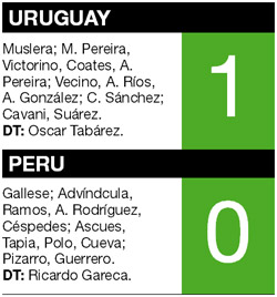 El seleccionado uruguayo de fútbol llegó a la punta de las Eliminatorias Sudamericanas con el triunfo ajustado 1-0 ante Perú, en el partido válido por la sexta fecha. El delantero Edinson Cavani, con un fuerte remate cruzado, marcó el único gol a los siete minutos del segundo tiempo. Los uruguayos ganaron un partido clave, ya que alcanzaron a Ecuador en la cima, con 13 puntos, mientras que los peruanos se quedaron con cuatro unidades, lejos de los puestos de clasificación, y extendieron su crisis futbolística.
