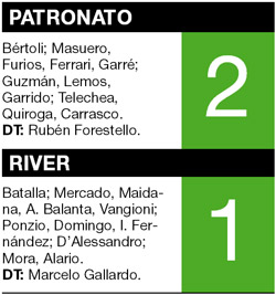 River, con un equipo combinado de titulares y suplentes y el debut del juvenil arquero Augusto Batalla, perdió anoche ante Patronato en Paraná. Sebastián Bértoli de penal y Mauricio Carrasco hicieron los goles del equipo entrerriano, que estiró su racha de invicto como local a 16 partidos. Rodrigo Mora había empatado para River, que ahora lleva seis partidos sin conocer la victoria. El visitante tomó la pelota y avanzó hasta tres cuartos del campo, donde Patronato realizó un bloqueo y recuperó para avanzar sobre el arco de Batalla los primeros minutos. A través de pelotas paradas consecutivas, el equipo local logró asediar a River pero sin llegar con fuerza en el área chica.