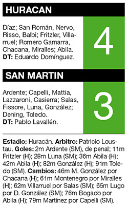 Huracán derrotó 4-3 a San Martín en Parque Patricios y se ubicó a dos puntos del líder Lanús, en la Zona 2 del campeonato, en un partido que lo tuvo dos veces abajo en el marcador, pero que remontó con una muy buena tarde de su goleador, Ramón “Wanchope” Abila.