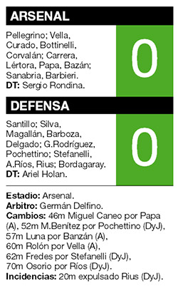 Arsenal tuvo todo para ganar, la iniciativa durante el partido y un rival que jugó setenta minutos con un hombre menos, sin embargo no supo aprovecharlo y debió conformarse con un deslucido empate sin goles ante Defensa y Justicia. El planteo de Santiago Rondina fue claro, ganarle a Defensa la pelea en la mitad de la cancha y atacar por los costados. Y la cosa le resultó bien al técnico de Arsenal en un noventa por ciento, porque no creó situaciones claras de gol, aunque no pudo concretarlas. Pero en el segundo tiempo, el partido se deslució cuando Defensa puso diez hombres en su campo y Arsenal se cansó de tirar centros, los cuales muy pocas veces exigieron a Santillo y los centrales.