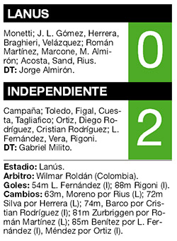 Independiente tenía que reivindicarse en su debut en la Copa Sudamericana y logró el primer chico con una victoria 2-0 frente a Lanús, que venía dulce tras haberse consagrado campeón de la Copa Bicentenario en la propia casa de su vecino de Avellaneda. Los goles fueron convertidos por Leandro Fernández y Rigoni, ambos en el complemento. El equipo de Gabriel Milito ya había tropezado en la misma cancha de anoche el pasado 8 de agosto ante Defensa y Justicia, y tempranamente se despedía de la Copa Argentina. Lanús tendrá revancha el 14 de septiembre en Avellaneda. De continuar en racha, el Diablo podrá aspirar a un lugar en el torneo que le quita el sueño a más de uno: la Copa Libertadores.