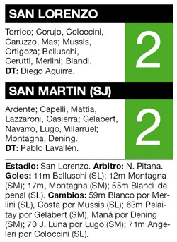 Santa jornada en el Bajo Flores. San Lorenzo hacía su presentación en el torneo de Primera División ante San Martín de San Juan, con el telón de fondo de la lluvia que regaló la tormenta de Santa Rosa. En un atractivo partido de ida y vuelta, abrió el marcador Belluschi con un soberbio tiro libre, pero los sanjuaninos lo dieron vuelta en cinco minutos con un doblete de Montagna. El Ciclón recién pudo igualarlo en el complemento con un discutible penal cobrado por el árbitro Pitana y concretado por Blandi. Con la presencia del Patón Bauza en la platea, al conjunto del uruguayo Diego Aguirre se le mojaron los papeles.