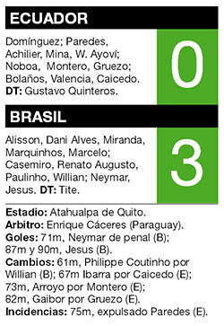 En el debut de Tite como seleccionador, Brasil como visitante dio una muestra de autoridad al golear en un escenario dificilísimo por 3-0 a Ecuador, por la séptima fecha de las Eliminatorias. Neymar abrió el marcador con un penal y el pleito se cerró con dos tantos del también debutante Jesus, todos en el complemento. El equipo dirigido por el argentino Gustavo Quinteros se quedó con diez por la expulsión de Paredes. De este modo, el conjunto brasileño acumuló 12 puntos y el martes recibirá a Colombia, en tanto que Ecuador, con 13 puntos, visitará a Perú.
