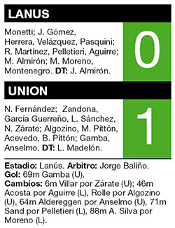 Lanús, eliminado el miércoles pasado de la Copa Sudamericana, prolongó su mala semana y ayer dejó su invicto en el torneo de Primera División al perder por 1-0 ante Unión. Almirón le dio descanso a algunos titulares y al equipo le costó hallar profundidad, pese a dominar el juego durante el primer tiempo y en buena parte del segundo, hasta el gol de Unión, que llegó con un cabezazo de Lucas Gamba tras una mala salida del arquero Monetti. En desventaja, el conjunto de Almirón intentó la heroica, pero chocó con la buena actuación de Nereo Fernández y con el travesaño, que devolvió un cabezazo de Herrera en el descuento.