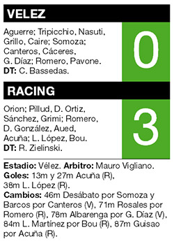 DEPORTES › RACING JUGO UN PARTIDAZO Y GOLEO 3-0 A VELEZ COMO VISITANTE