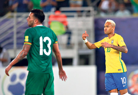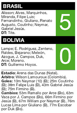 Brasil festejó muy seguido en la noche de Natal.Brasil está en la búsqueda de su mejor versión de la mano del flamante entrenador Tité, y anoche arrolló con gran fútbol a un débil Bolivia. Tras los sucesivos triunfos ante Ecuador y Colombia, llegaba el turno de recibir a los bolivianos, en Natal. Y Neymar tardó apenas 10 minutos en romper los esquemas para poner en ventaja al local. Ronald Raldes buscaba destino para una pelota que le quemaba en los pies en la mitad de la cancha, Neymar se la robó y se fue derecho al área rival. El delantero combinó con Gabriel Jesús y definió con el arco vacío. A partir de ahí, Brasil fue el dominador absoluto de las acciones.