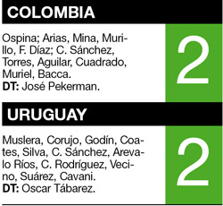 Los charrúas saboreaban el triunfo cuando a los 84 tras un centro de Cuadrado desde la derecha, Mina cabeceó y puso la pelota por arriba del arquero y cerca del ángulo superior derecho para el 2-2 final.
