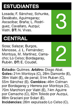 Estudiantes continúa en la cima de la Primera División, con 16 unidades, después de superar ayer a Rosario Central por 3-2 en el estadio de Quilmes, por la sexta fecha del torneo. Los tantos del conjunto platense los anotaron Israel Damonte, a los 28, Lucas Viatri, a los 38, de penal, y Facundo Sánchez, a los 55; mientras que para el visitante Walter Montoya había abierto a la cuenta en el marcador a los 21, y Marco Ruben, lo empató a los 51. Para los rosarinos la derrota se vio agravada por la expulsión del volante Giovani Lo Celso, un jugador clave de cara el clásico del próximo domingo ante Newell’s.