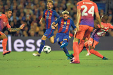 Más allá de la actuación destacada de Messi, con el auxilio del magnífico Andrés Iniesta, Barcelona fue superior en todas sus líneas a Manchester, a pesar de las bajas por lesión de Gerardo Piqué y Jordi Alba. El equipo inglés intentó imponer su ritmo, con presión y posesión de pelota, pero ese plan duró pocos minutos, hasta el primer gol de Messi. El partido se aclaró aún más para Barcelona cuando Bravo, luego de un error en la salida con la pelota, fue expulsado (tapó un remate de Suárez con las manos, pero fuera del área y como último hombre), y dejó con diez a los ingleses.