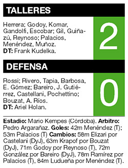 Talleres de Córdoba aprovechó anoche su condición de local en el estadio Mario Kempes y derrotó por 2-0 a Defensa y Justicia, en el otro de los duelos de los equipos que necesitaban ganar para salir de los puesto bajos de la tabla. El primer gol del encuentro lo anotó Menéndez, luego de recuperar una pelota tras una mala salida del equipo de Holan. Hasta ese momento, la visita había mostrado mejores armas e incluso le habían anulado mal un gol. En el arranque del complementario, asistido por Menéndez, Palacios puso el 2-0.