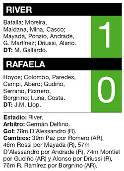 Fue claro el local cuando la pelota pasaba por Andrade y hasta logró desequilibrar con Martínez por la izquierda. Pero no generó peligro. Lo más claro fue un zurdazo del ex Huracán que se fue muy cerca del ángulo. Rafaela estuvo cerca pero Batalla apareció para evitar la caída. La desesperación se apoderó de River a medida que pasaban los minutos, y de esa manera se le nublaban las ideas para ir en busca de la victoria. Pero el que despejó todo fue el ingresado D’Alessandro, que ejecutó un tiro libre, la pelota rozó en la barrera y descolocó al arquero para ingresar por el otro lado.