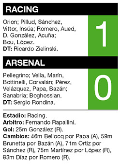 Racing derrotó ayer 1-0 a Arsenal, como local, y se integró al grupo de los escoltas de Estudiantes, quien jugará hoy. El equipo que dirige Sergio Rondina sumó su quinta derrota cuando se llevan disputadas siete fechas. En el primer tiempo, el equipo que entrena Ricardo Zielinski fue quien tuvo la posesión de la pelota, y dispuso de las oportunidades más claras para abrir el marcador. Su rival careció de profundidad, y atinó a arribar al arco de Orion por medio de centros. A los 25 minutos, Aued remató desde afuera del área, Diego González la desvió, y puso al local en ventaja. A los 29, Pérez pateó desde lejos, y pasó cerca, en lo que fue la primera aproximación del conjunto visitante. Seis minutos después, Bou disparó y se fue junto al palo derecho de Pellegrino. A los 40, tras una jugada en la que la tocaron varios, González metió un buen pase entre líneas y habilitó a Bou, quien quedó mano a mano y su remate se fue desviado.