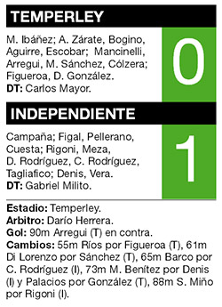 Independiente superó 1-0 a Temperley, que cayó en zona de descenso, en un encuentro correspondiente a la séptima fecha. El único gol lo anotó Adrián Arregui en contra de su propia valla, a los 46 minutos del segundo tiempo. Con este éxito, los de Avellaneda se mantienen en las posiciones de vanguardia con 14 puntos, mientras que Temperley se quedó en ocho unidades.