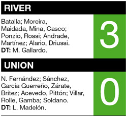 Igual de intenso fue el inicio del complementario. Unión experimentó una notable mejoría en su juego y, ahora con el viento a su favor, puso varias veces en aprietos a River. Rolle, de tiro libre, estuvo cerca del empate pero el arquero de River no perdió de vista la pelota y la embolsó sin problemas. Gallardo se cansó de ver llegar a los dirigidos por Madelón y volvió a meter mano en el equipo –en el entretiempo había sacado a Rossi, lesionado– para tener un poco más de peso ofensivo. La apuesta funcionó porque Mora y Arzura entraron bien y le dieron al equipo lo que necesitaba. Cuando Unión bajó su intensidad por el cansancio, River aceleró y se lo llevó puesto. El segundo gol llegó en otra jugada de tiro de esquina. Esta vez fue Arzura el que, a la carrera, cabeceó el centro de Pity Martínez para anotar su primer gol en River y terminar de encender la fiesta en el Minella. Sobre el final Moreira tuvo el tercero, pero Nereo se lo tapó con los justo. Y en el descuento, con el trámite liquidado, Alario le puso el último sello, asegurando una pelota le quedó servida dentro del área.