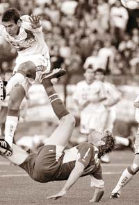 Banfield gastaba energía de a ratos, presionando y achicando, pero carecía de profundidad y se repetía en los pelotazos al área para Ceballos. Así consiguió tener dos oportunidades que no prosperaron; así iba a marcar sobre el final el tanto del empate (¿cuántas veces anunciado?). Antes del golazo de Palermo, quien conectó con una chilena un buen centro de Cascini, acaso lo mejor que hizo ayer el volante, el desgastado Tevez había tenido una estupenda oportunidad de gol al puntear una pelota, ante la salida del arquero Barbosa, que lentamente se hubiera metido en arco de no ser por la reacción de Cocca, que consiguió despejar sobre la línea; después, Tevez iba a estrellar un tiro libre en el palo derecho.