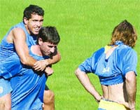 Carlos Tevez, feliz, a caballito de Abbondanzieri y junto a Schiavi, en el entrenamiento de ayer.