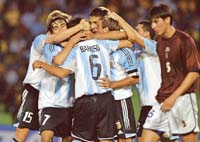 Pero más allá de que no lo merecía, Argentina se encontró con un gol increíble a partir de una doble falla grosera de la defensa rival, que le empezó a facilitar la resolución del encuentro. La vieja frase del fútbol indica que “dos cabezazos en el área son gol”, y así ocurrió. Claro que ese lugar común no dice nada sobre que esos cabezazos sean de los defensores. Y en este caso, ocurrió de esa manera. Barrientos ejecutó un centro pasado, que era fácil para el arquero. Sin embargo, Fedor anticipó a Aponte y metió un frentazo contra su propio arco. En ese momento, hostigado por Barroso, apareció para salvar la situación Raúl González, pero el defensor venezolano en vez de rechazar, también cabeceó contra su valla y anotó el primer gol argentino.