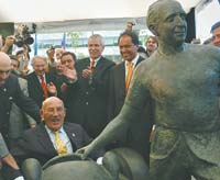 Flanqueado por José Froilán González, la mayor gloria viviente del automovilismo argentino, y el vicepresidente de la Nación, Daniel Scioli, el ex piloto británico Stirling Moss se “probó” la estatua de bronce en homenaje a Juan Manuel Fangio que fuera inaugurada ayer en Puerto Madero bajo el auspicio de DaimlerChrysler, Repsol YPF y la Fundación Fangio. La escultura, obra del artista catalán Joaquín Sabaté Ros y que pesa seis toneladas, es una recreación a tamaño natural del cinco veces campeón del mundo de Fórmula 1, fallecido en 1995, y de la Mercedes-Benz W196 de F-1, que Fangio condujera teniendo a Moss como compañero de equipo. Esta es la quinta pieza inaugurada en la última década en homenaje a Fangio: las demás se hallan en los circuitos de Montmeló (España), Nürburgring (Alemania), Monza (Italia) y Montecarlo (Mónaco). “Era un hombre muy especial, un verdadero caballero: nunca me hizo una jugada sucia, era fantástico”, declaró con emoción Moss. “En las carreras nos llamaban ‘el tren’, porque nuestros autos iban pegados uno detrás del otro.”