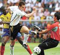 Un rato más tarde, Ballack respondió a toda su fama con un pase de potrero, empalando la pelota para Klose, que primero se la llevó con el muslo y lo que fuera, a lo Kempes, y después empujó la pelota contra el arco vacío. Curioso caso el de Miroslav Klose: en el Mundial de Corea-Japón se anotó con cinco goles, todos de cabeza, y ahora lleva cuatro tantos, todos con el pie. Su socio en ofensiva, el también polaco de nacimiento Lukas Podolski, cerró la cuenta en el segundo tiempo con un remate cruzado, después de una buena jugada de conjunto. Ecuador nunca opuso demasiada resistencia y por momentos vio pasar la pelota con la misma impotencia con que los checos la veían pasar ante los negritos de Ghana o los serbios contra los argentinos. La diferencia de tres goles pudo haber sido mayor, aunque sobre el final los alemanes bajaron un cambio y se limitaron a esperar el final.