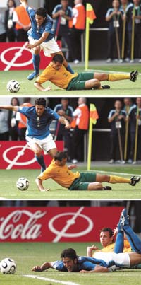 En el primer tiempo, Italia tuvo oportunidades como para marcar, pero en el segundo, después de la expulsión de Materazzi, se le empezó a complicar. Ya le había pasado con Estados Unidos: frente a equipos duros, muy disciplinados, no la pasa bien. Para el alargue, daba la sensación de que los australianos estaban mejor parados. Y los italianos ya estaban pensando en cargar toda la culpa contra la FIFA por la expulsión de Materazzi, pero cuando nadie lo esperaba, Grosso rompió los reglamentos, se mandó por izquierda, le hicieron penal y ganó Italia. Están adentro. Y si ganan en la próxima deberán jugar contra Argentina o Alemania.