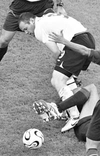 En la mitad de la cancha, Frings pegó, huyó y parecía que no lo pescaban, pero los italianos mostraron un video y pagó por su supuesto golpe a Cruz. Otro que pagó con una suspensión fue Deco. Enojado porque los holandeses no devolvieron la pelota tras mandar una pelota afuera para la atención a un compañero, practicó el corte de la manzana, pero con un naranja. También cortó, pero de un codazo, el italiano De Rossi. Tal golpe le aplicó al yanqui McBride que se comió cuatro jornadas de suspensión. El mediocampo de los duros lo completa Figo, que en la batalla de Nuremberg ante los holandeses metió cabezazo limpito como el de Ayala a Alemania, pero el árbitro Ivanov no vio nada.