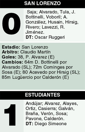 Estudiantes se llevó un gran triunfo del Nuevo Gasómetro al derrotar 1-0 a San Lorenzo en un entretenido partido en el que el equipo de Ruggeri jugó un gran primer tiempo, pero a partir del gol de Pablo Alvarez, se desdibujó y permitió que su rival justificara la victoria.