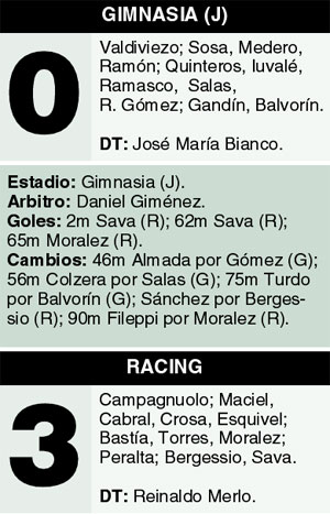 Atrás quedó para Facundo Sava la impotencia de haber sido excluido del equipo titular hace un par de fechas. El delantero volvió a ganarle la pulseada a Reinaldo Merlo y, a fuerza de goles, encaminó a Racing a su segunda victoria consecutiva del torneo. El equipo de Avellaneda se aprovechó de un limitado Gimnasia, en Jujuy, y continúa en franco ascenso. El conjunto local, por su parte, dejó una pálida imagen y sufrió una nueva derrota –la sexta del campeonato–, que lo acerca a la zona de promoción.