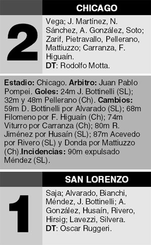San Lorenzo se despidió definitivamente de su ilusiones de pelear el Apertura en la noche de Mataderos. Si contaba con alguna chance, el conjunto de Oscar Ruggeri la dilapidó al caer 2-1 con Chicago, que de esta manera se recuperó de la increíble caída ante Independiente la semana pasada. Jonathan Bottinelli puso en ventaja al conjunto de Boedo, pero dos goles de Cristian Pellerano, la gran figura de la cancha, dieron vuelta el marcador.