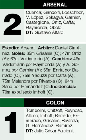 De entrada, Colón se adelantó en el campo de juego y arrinconó a su rival. A los 35 minutos, el visitante se puso en ventaja: Hernández asistió a Grisales, que definió cruzado ante la salida de Cuenca. Arsenal no lograba arrimar peligro el arco defendido por Tombolini. Raymonda apenas se podía asociar con Caffa y Obolo quedaba muy aislado. Pero el ingreso de Valdemarín en la segunda etapa le dio oxígeno al local. A los 2 minutos, el ex jugador de Vélez asistió a Ortiz para que decretara el empate y, a los 18, un error de Grisales derivó en un centro de Obolo, que Valdemarín conectó de cabeza para dar vuelta el resultado, sumar un triunfo vital y alimentar el sueño de Arsenal de pelear por el título.