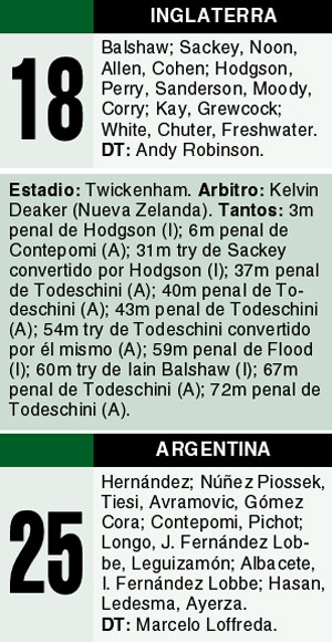 En desventaja, los campeones mundiales desplegaron su mejor repertorio. Con un juego agresivo como argumento, Inglaterra presionó y consiguió el descuento. Primero con un penal de Flood y, minutos después, con un try de Balshaw. Cuando parecía que la defensa argentina se derrumbaba, Los Pumas volvieron a mostrar su tradicional garra. Dos penales de Todeschini sirvieron para sacar una nueva ventaja y decretar el 25-18. Los intentos desesperados del equipo inglés no tuvieron éxito. Sólo quedó tiempo para que los forwards y los backs se lucieran ante un conjunto que parece no encontrar el rumbo. Los problemas con los dirigentes de la UAR quedaron al margen por unos segundos. Los Pumas consiguieron un triunfo histórico en Londres.